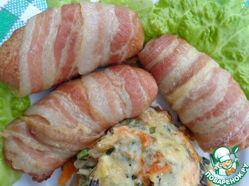 Половинки сарделек обернуть беконом. Разложить на противне, запечь в духовке при температуре 200 градусов 10 минут.