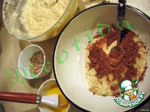 чайную ложку белого теста, перпендикулярно к ней чайную ложку шоколадного теста, украшаем семечками -