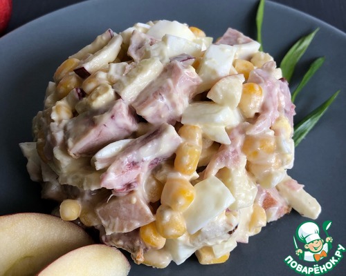 Обычно с курицей сочетают ананас, но у меня было яблоко и сладкую нотку салату я решила придать с помощью него. Получилось очень нежно