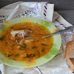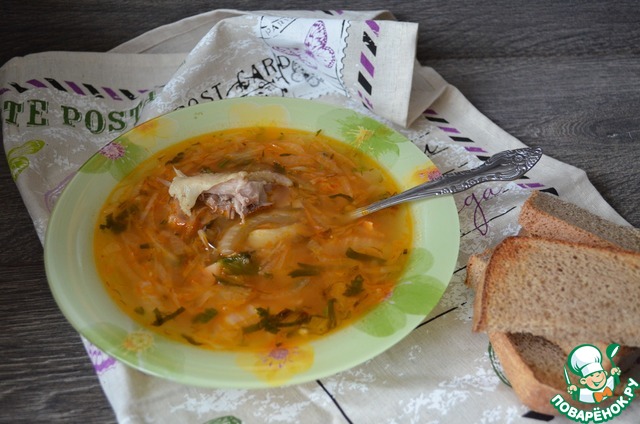 Обжаренные овощи выкладываем в кастрюлю с супом, добавляем приправу, досаливаем по вкусу, перчим. Достаем куру, режем ее небольшими кусочками и скрадываем обратно в кастрюлю.