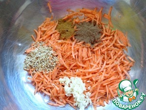 Добавить к моркови кунжут, приправу, кориандр, соль, сахар, холодное оливковое масло, чеснок, уксус.