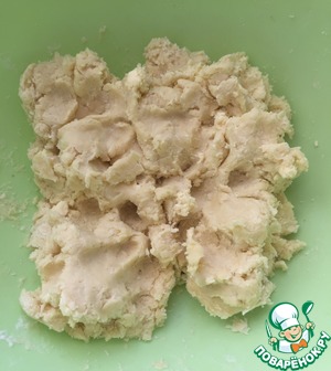 В глубокой миске сливочное масло рубим на мелкие кусочки ножом, вилкой либо натираем его на терке. Перетираем масло с мукой. Сметану мешаем с содой и добавляем в муку с маслом. Всё тщательно перемешиваем.