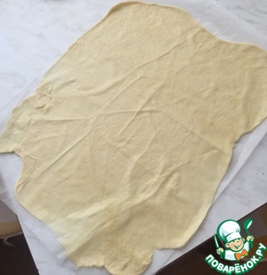 Тесто достаем из холодильника и делим на 4 части. Начинку визуально делим на три части. Раскатываем тоненько тесто (раскатываем на пергаментной бумаге, чтобы потом его удобно было перекладывать на противень). Противень смазываем подсолнечным маслом и кладем на него первый корж, сверху равномерно распределяем 1/3 часть начинки. Раскатываем второй тоненький корж и кладем его сверху. Раскладываем равномерно вторую часть начинки и сверху опять кладем корж. И так далее в конце накрываем последним слоем коржа.