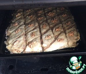 Далее режем всё аккуратно ромбиками ножом, смазываем поверхность яйцом и серединку каждого ромбика слегка придавливаем орешком. Помещаем в разогретую до 180 градусов духовку на 20 минут до золотистой корочки. Достаем пахлаву из духовки, обильно поливаем медом (чтобы мед хорошо растекался можно его 5-7 секунд разогреть в микроволновке) и отправляем в духовку еще на 5 минут. Пока пахлава горячая очень важно разделить ее на ромбики и разложить на тарелки (иначе потом отодрать ее от противня будет сложно). Приятного аппетита.