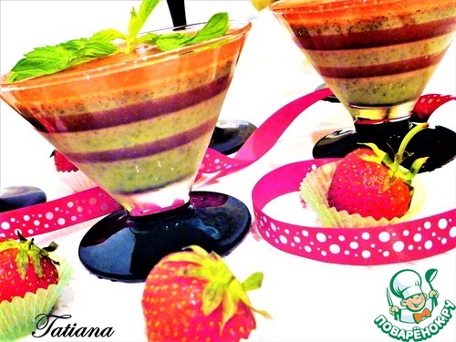 В йогурт добавьте мятный сок ( 2 ст. л.) и 2 ст. ложки сахарной пудры, в клубничное пюре (400г.) также добавьте сахарную пудру 2 ст. ложки.