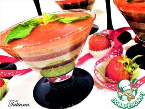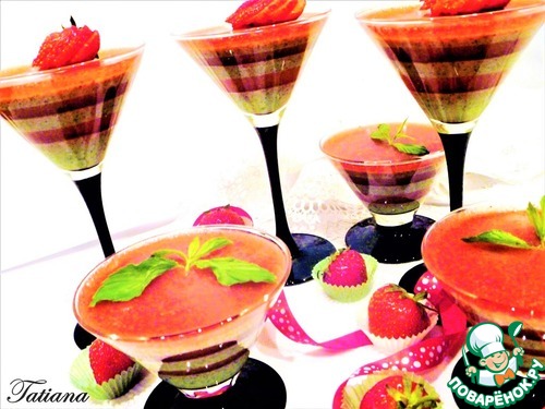 Желатин из одной чашки влейте в мятный йогурт, желатин из второй чашки в клубничное пюре. В небольшие креманки (бокалы)слоями разлейте йогуртовое и клубничное желе. Каждому слою надо немного "закрепиться"в холодильнике. Для удобства приготовления, поставьте креманки на небольшой поднос или на разделочную доску. -