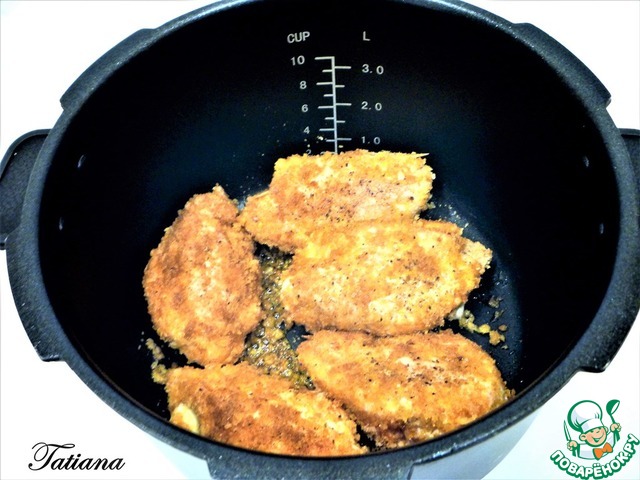 Куриные "кармашки" щедро обваляйте в пряной панировке, выложите в разогретое масло. Обжарье по 3-4 минуты с двух сторон. Переключите режим мультиварки на "тушение". Время приготовления 20 минут. По сигналу о готовности, не открывайте крышку мультиварки еще 10-12 минут. -