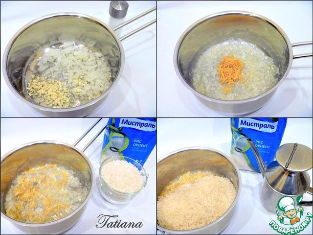 Маленький лимон хорошо вымойте, натрите цедру, выжмите сок. Небольшую луковицу и дольки чеснока мелко порубите. В растительном масле (2 ст. л.)потушите до полупрозрачности лук и чеснок, добавьте лимонную цедру, потушите еще пару минут. Рис (белый, длиннозёрный) промойте до прозрачной воды, слейте воду от промывки через сито, влажный рис поместите в кастрюлю с луком и цедрой, добавьте растительное масло (2 ст. л.) прогрейте рис помешивая (рис должен пропитаться маслом).
