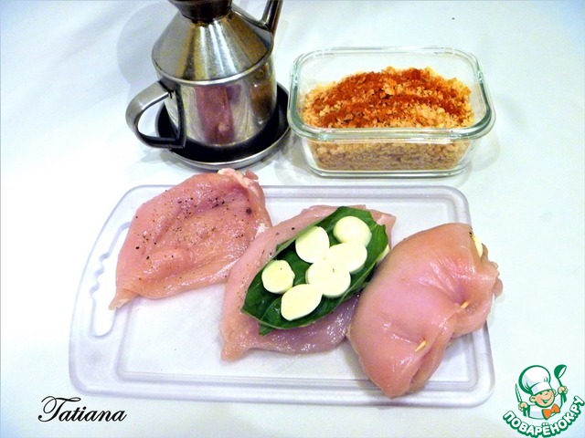 Заготовленные "кармашки" раскройте "книгой", посолите, поперчите. Выложите в центре куриного "кармашка" несколько пластин моцареллы, сверху 2-3 шпинатных листочка, затем еще слой моцареллы."Кармашек "закройте, скрепите разрез деревянной зубочисткой, посолите и поперчите с двух сторон. Панировочные сухари перемешайте с паприкой. -