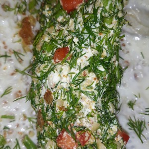 Приготовить вторую начинку: нарезать помидор и зелень, измельчить арахис, добавить творог и всё перемешать.
