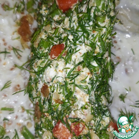 Приготовить третью начинку: нарезать мелко сыр и зелень, измельчить грецкие орехи, добавить творог и всё перемешать.