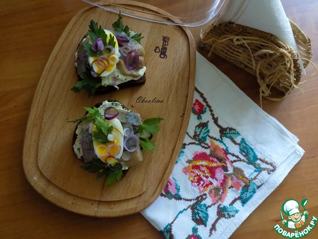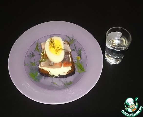 На куски Бородинского хлеба намазываем щедро сырную намазку, выкладываем ломтики сельди. Зависит от куска хлеба, у меня поместилось по 3 ломтика. Яйца сварите так, как вы любите. Можно "вкрутую" и можно "вмешочек". Я люблю, чтобы желток оставался вязким. Выкладываем разрезанное яйцо напополам. Опять же от куска хлеба, сколько поместится. У меня поместилось по половинке яйца. Украшаем верх листиками зелени. У меня петрушка и присыпаем мелко порезанным красным луком. Кто любит поострей, сверху можно выложить ещё немного горчицы зерновой. Тосты готовы!