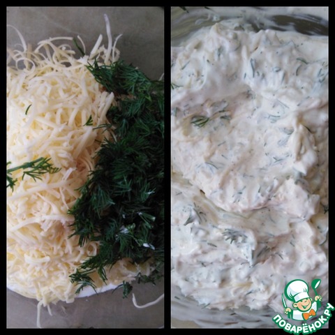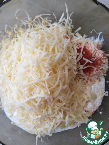 Сыр натереть на мелкой тёрке (100г) и добавить его в миске со специями, майонезом и сметаной.