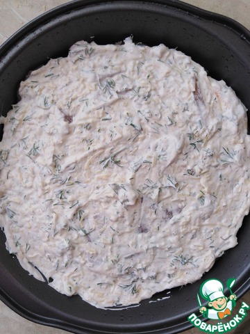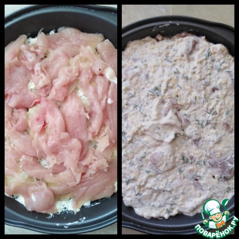 Смазать форму растительным маслом и выложить одним слоем куриную грудку. Диаметр формы 24см. Посолить и поперчить мясо частью специй.