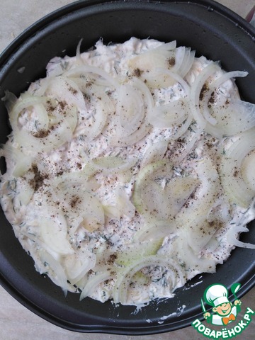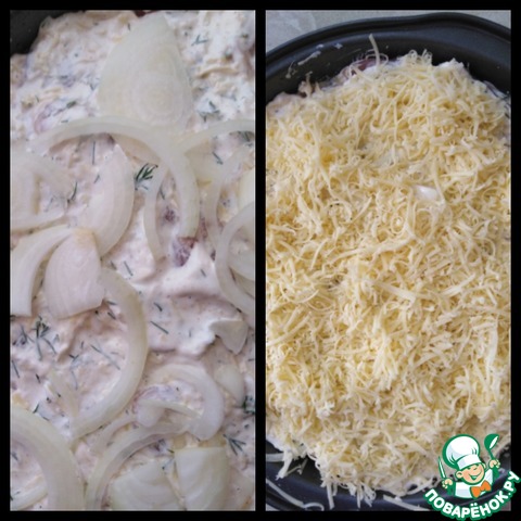 Сверху положить равномерный слой лука (полу кольца). Посолить, поперчить частью специй.