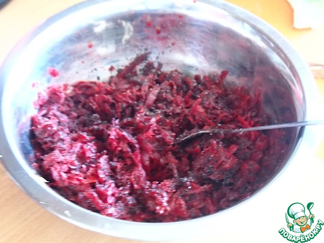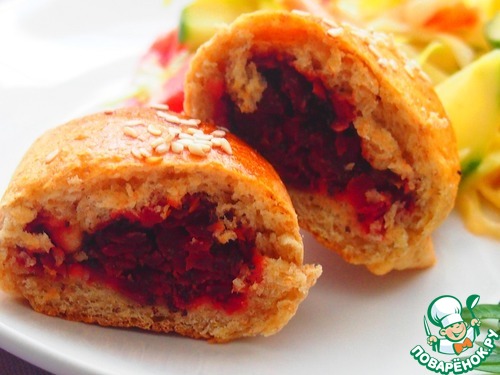 Начинка проста до безобразия. На подсолнечном масле поджарить лук, добавить натертую на крупной терке свеклу и морковку. Тушить под крышкой на маленьком огне до мягкости. Добавить томатный соус, перемешать, открыть крышку и еще немного подержать на огне, чтобы испарилась лишняя жидкость.