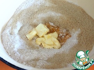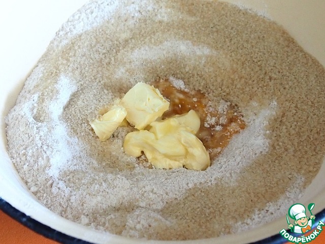 Для теста нужно смешать оба вида муки, масло немного нагреть, чтобы было очень мягкое.