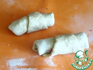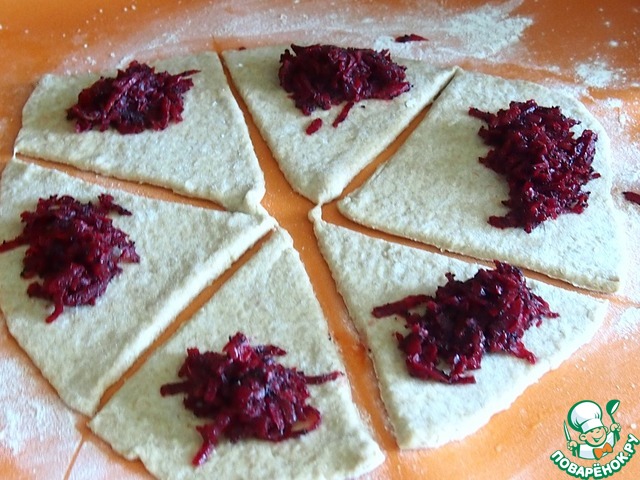 Тесто разделить на три части. Каждую часть раскатать в круг, разделить круг на треугольники. На широкую сторона треугольников положить начинку.