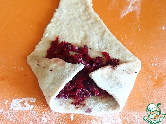 Края с широкой стороны треугольника немного вытянуь, переложить в направлении к центру и там, где они соприкасаются с тестом боковых сторон, прижать пальцами.