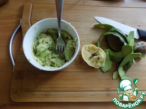 Авокадо чистим и убираем косточку. Я буду давить авокадо вилкой, чтобы в намазке чувствовались его кусочки. Нарезала небольшими кусочками авокадо керамическим ножом (так оно быстро не потемнеет), поместила в керамическую посуду и из одной лимонной дольки отжала сок прямо на кусочки. Используя вилку, раздавила авокадо в массу.