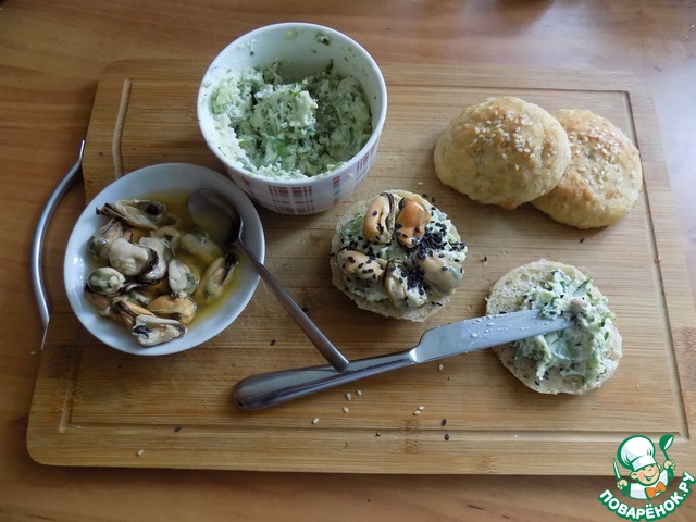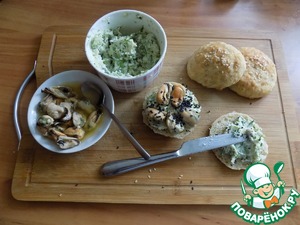Намазываем щедро разрезанные пополам булочки авокадно-сырной намазкой. Сверху выкладываем мидии маринованные столько, сколько поместится. У меня уже готовые мидии в банках. -