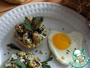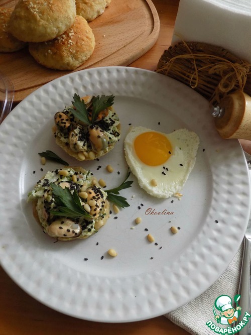 Подаём на завтрак или перекус. Выкладываем бутерброды на тарелку, посыпаем чёрным кунжутом и орешками кедровыми. Дополним всё глазуньей. Посыпать можно чем хотите, например: семечками, другими орехами... и т д или вовсе не посыпать!