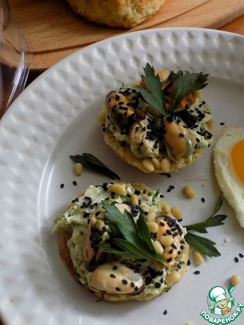 Из серии "Полезная еда". Намазка на бутерброды из авокадо, творожного сыра с чесноком и петрушкой, дополненная маринованными мидиями на овсяных булочках. Завтрак.