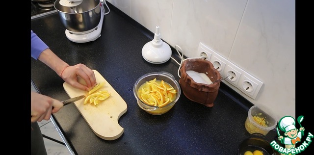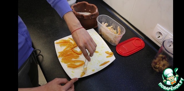 Апельсиновые корочки режим на полосочки ~0,5 см. И перекладываем в будущий сироп.