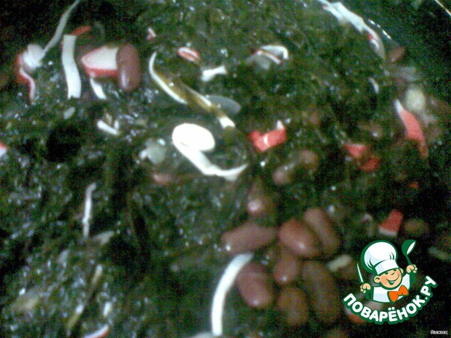 прожарить мелко нарезанный лук с маслом, добавить сваренную морскую капусту, тушить минут 10. Порезать крабовые палочки мелко, добавить. И фасоль в конце. заправить соевым соусом (я заправляла специями внутри пакетика капусты), добвить потертый на терке зубчик чеснока. Закрыть крышку, дать постоять еще минут 5. Все. ПРиятного аппетита!!!