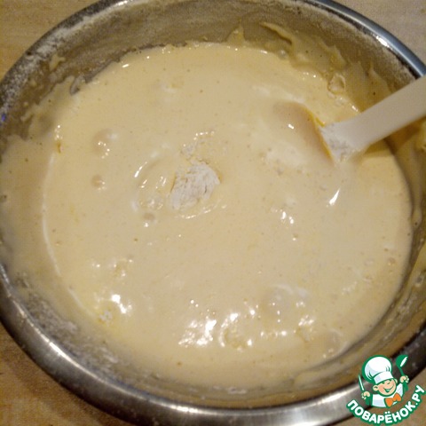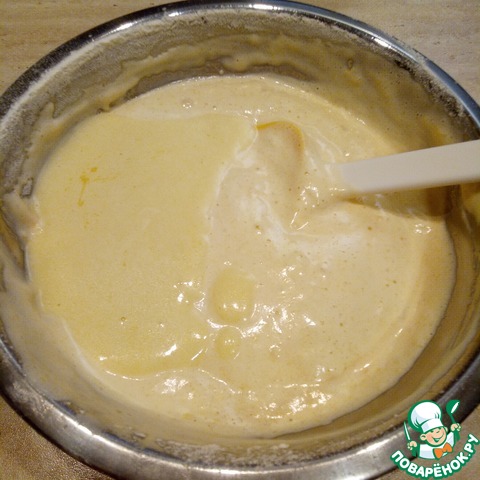 Масляную смесь вылить с краю миски и такими же аккуратными движениями, в одном направлении, вмешать.