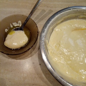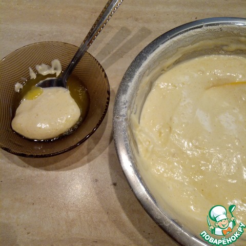 В подготовленное масло добавить ложку теста и хорошо перемешать.