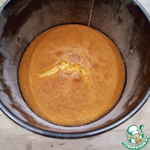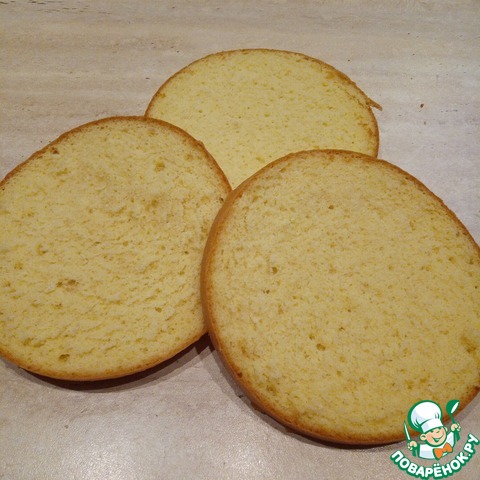 По необходимости верхушку подровнять и разрезать бисквит на три коржа.