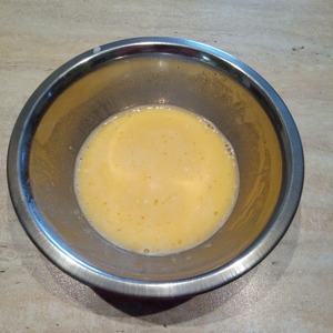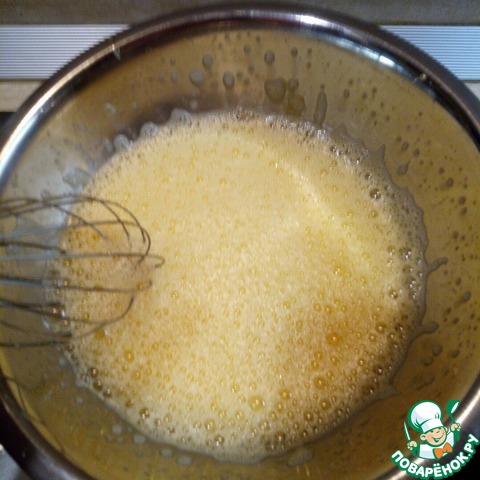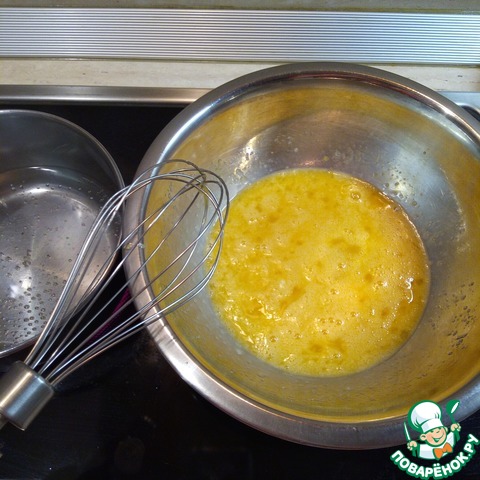 Взбивать яйца на водяной бане на средних оборотах миксера. Масса должна запузыриться, немного увеличиться в объеме. Взбивать до хорошо теплого, но не горячего (!) состояния. Периодически пробовать температуру пальцем.