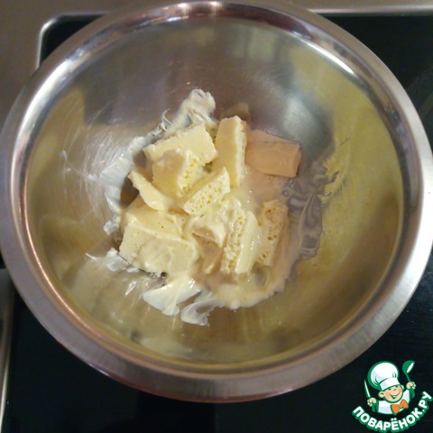 Белый шоколад поломать на кусочки и растопить на водяной бане. Миска не должна касаться воды. Остудить до теплого.