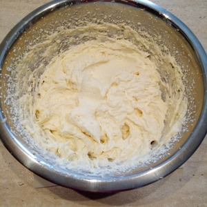 Затем снять миску с "бани" и уже на высоких оборотах продолжать взбивать 4-6 мин. Масса будет становится воздушной, побелеет, увеличится в объеме. С венчика должна стекать лентой. Внимательно следить, не перебить!