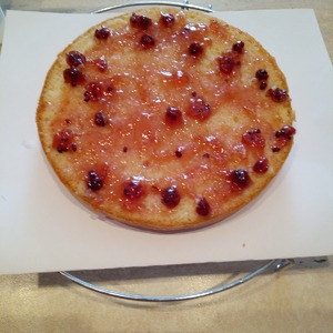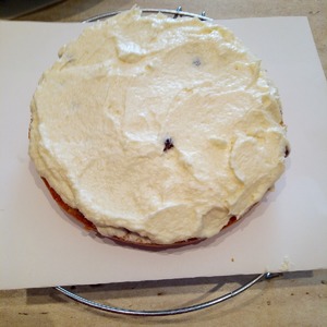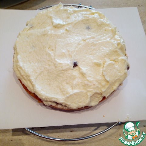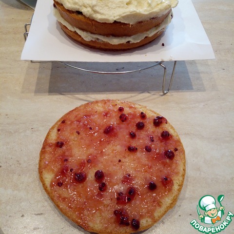 Продолжить собирать торт, смазывая коржи джемом и покрыть второй частью крема. Средний корж смазать джемом с двух сторон. Низ верхнего коржа тоже смазать джемом и смазанной стороной накрыть торт.
