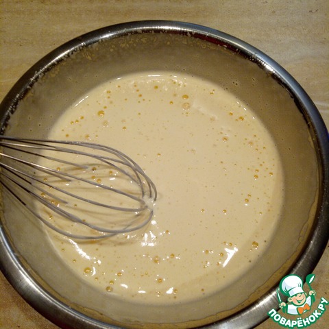 Тонкой струйкой влить яично-мучную смесь, непрерывно помешивая венчиком. Варить на малом огне до загустения, интенсивно работая венчиком!