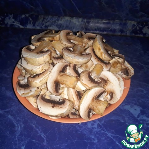 Нарезать шампиньоны полосками и потушить до готовности (5 минут).