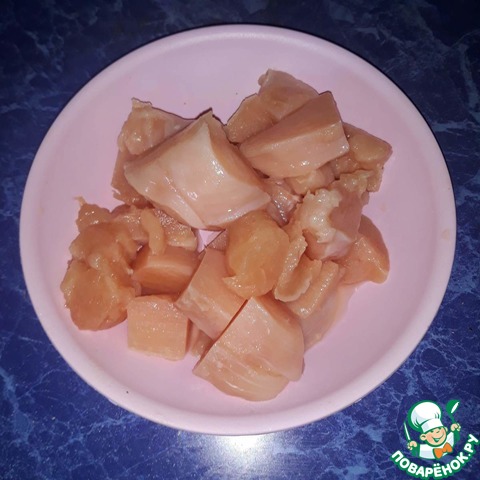 Нарезать куриное филе средними кубиками. Потушить до готовности или же отварить (7 минут).