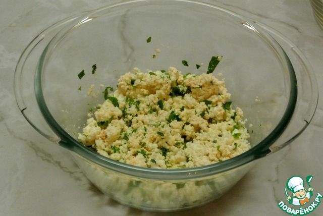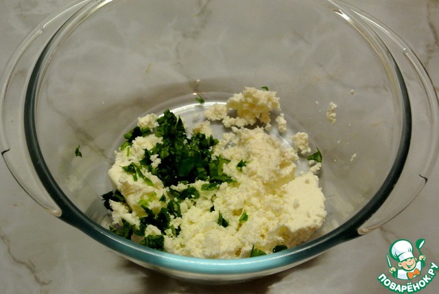 В творог добавить мелко нарезанную зелень кинзы или укропа.