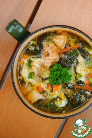 Следом влить яйцо, разбалтывая его в бульоне вилкой или ложкой, чтобы образрвалась "паутинка". Досолить по вкусу, посыпать зеленью, после закипания снять с огня. -