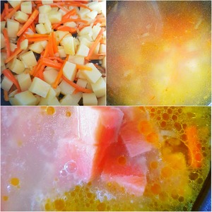 Затем добавить в кастрюлю рыбу, варить около 5 минут. -