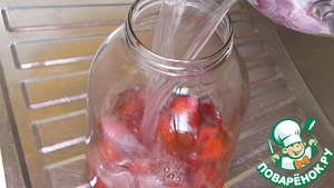 Заливаем сиропом. Для того, чтобы банка не лопнула, делаю это на металлической мойке.