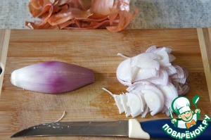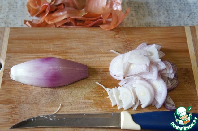 Лук-шалот нарезать тонкими полуколечками. За неимением можно заменить на красную луковицу.