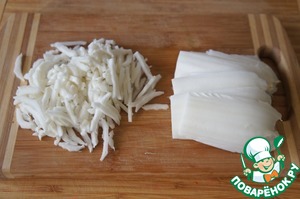 Центральную твердую часть нарезать поперек тонкой соломкой. Отправить туда же.