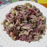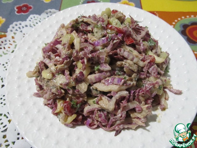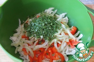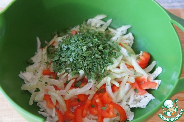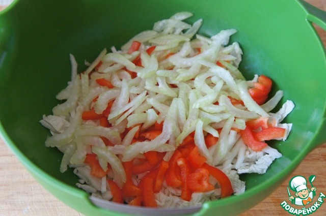 У пекинской капусты отрезать мягкие боковые части листье и нарезать их широкими полосками. Высыпать с широкую, глубокую миску.