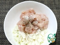 Лук нарезать четвертькольцами. Куриное филе порезать небольшими кусочками. Смешать в миске с солью, перцем и 2 ст. л. майонеза. Оставить на 15 минут. |