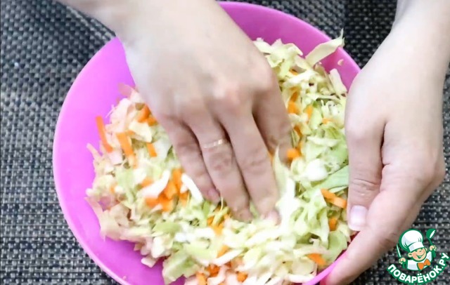 Измельчить морковь, нашинковать капусту. Все смешать в миске с солью и перцем. |