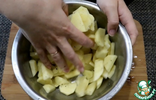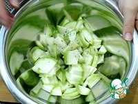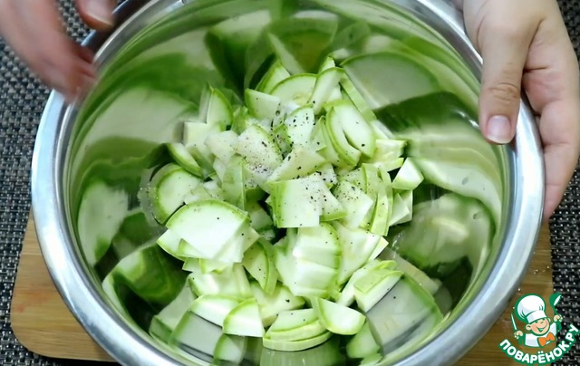 Кабачки порезать чествертькольцами, посолить и поперчить. |