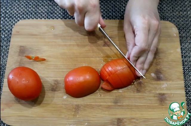 Рть кольцами. Посолить, поперчить и перемешать. Помидоры порезать четвертькольцами. |